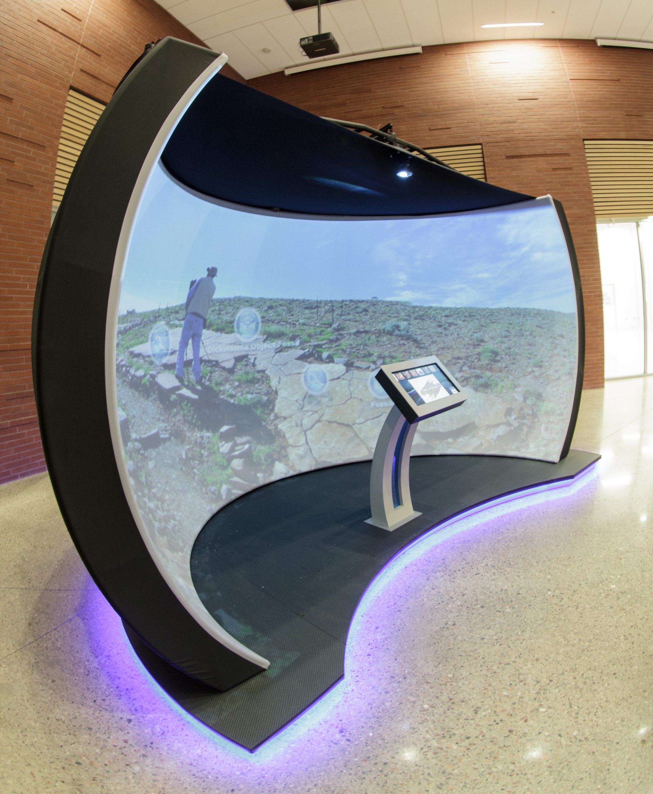 We worked with SESE on the Immersive Interactive Exploration Environment (I2E2), in a GeoDome Panorama. Visitors use a touchscreen to interactively explore Earth and space science on our 4m semi-permanent Panorama, powered by a 200 series OmniFocus projection system. In 2015, SESE took advantage of the 200 series’ easy upgrade path to swap in a new, brighter projector with their existing lens. Staff at ASU’s School of Earth and Space Exploration (SESE) use WorldViewer and WorldComposer to tell immersive, interactive stories of the cross-disciplinary work taking place there. Current WorldViewer content includes ASU’s fully interactive Virtual Field Trips of geological features around the Earth, as well as panoramic images of the surface of Mars from the Curiosity Rover landing. The I2E2 exhibit also features NASA JPL’s Eyes on the Solar System, a tool for interactive exploration of real-time NASA mission data, enabled for Elumenati immersive environments through our continuing relationship with NASA JPL.