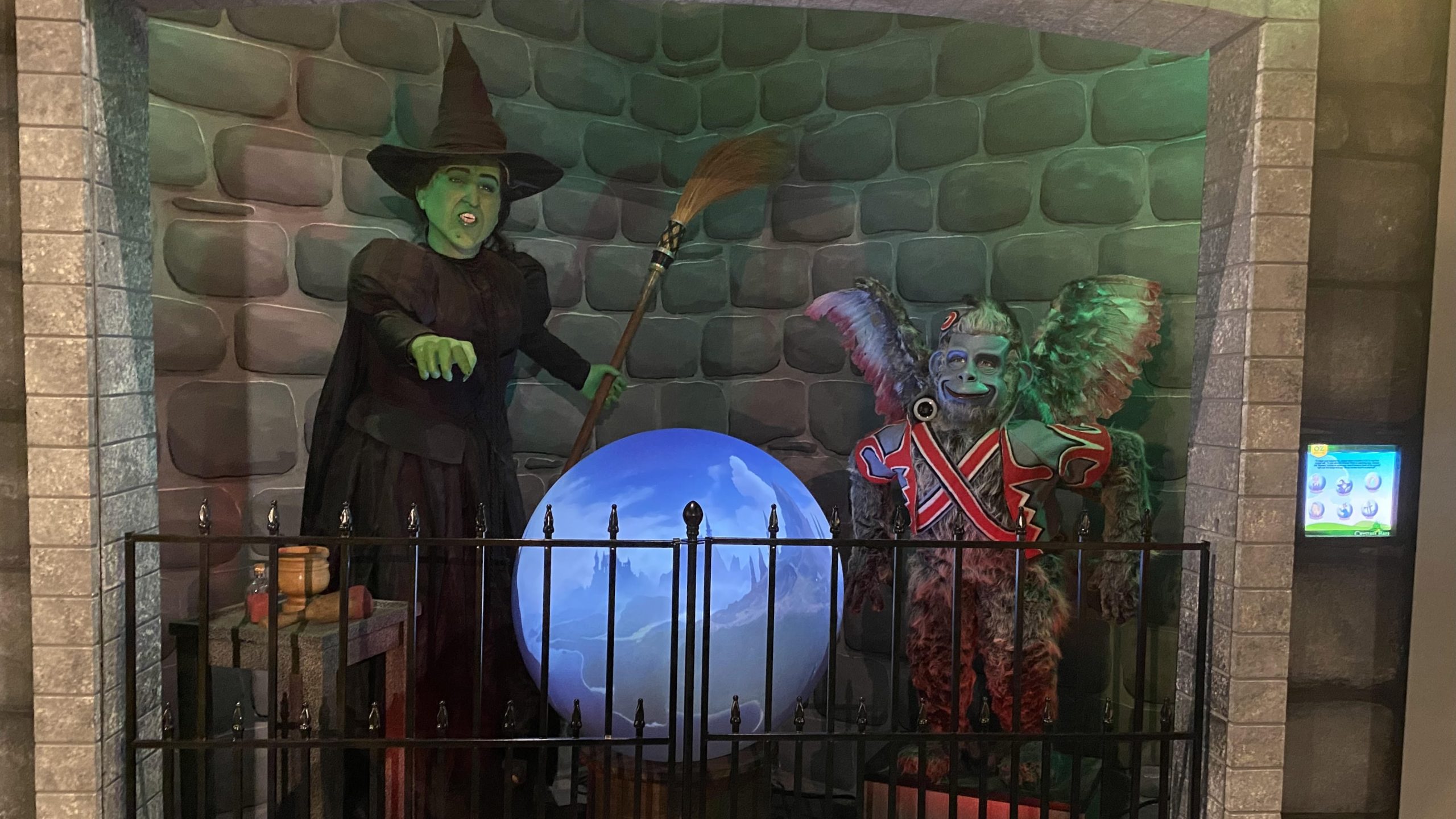 We customized the globe with a folded OmniFocus lens, allowing us to mount the projector horizontally for a low profile that fits into an alcove with the Wicked Witch herself. Next to the Witch stands a Flying Monkey, where we placed a hidden camera. Guests activate it by waving their hands in a magic-wand style, triggering the camera feed to show up on the globe – so the Witch can see the guests in her Crystal Ball, much like Dorothy. We also designed a touchscreen user interface featuring floating bubbles like the ones in the movie, with custom-created representations of characters in both the film and the original book (written by L. Frank Baum with illustrations by W. W. Denslow – now open-source for public use).